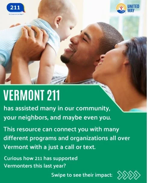 United Way helps fund and support Vermont 211, a critical resource connecting our neighbors to trained specialists offering help with disaster assistance, stable housing, food security, access to health care, employment services, veteran services, childcare and family services, and much more.